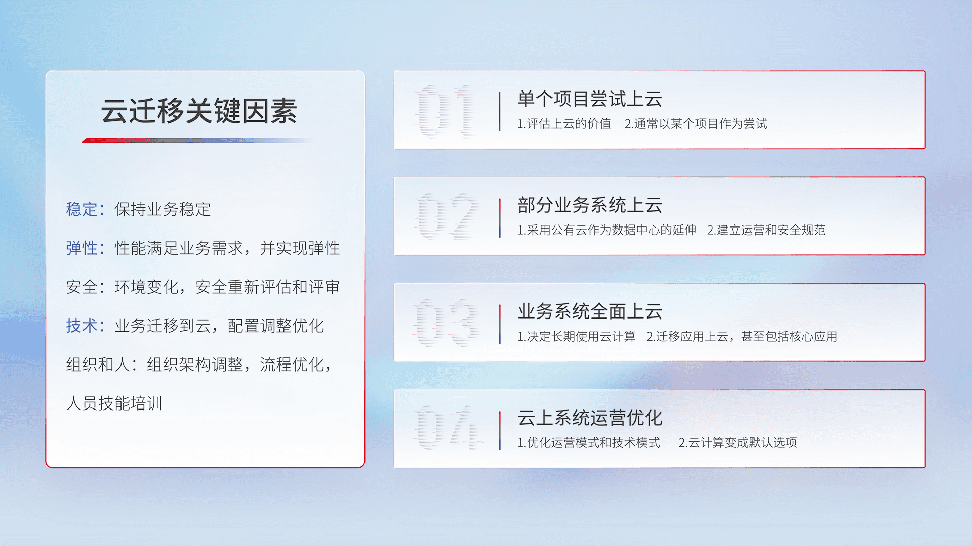 结合实际业务,,,,从规划设计、、、、云平台选型、、云原生改造、、、、数据迁移、、、集成交付,,,,迁移全过程为客户识别最佳上云路径,,,,做好风险识别管理,,,设计网络架构、、、身份权限、、安全审计合规、、、、操作审计、、、日志审计、、监控告警策略、、、、多站点容灾设计等,,,对云上基础设施进行整体规划,,提升IT治理水平,,,,以满足弹性、、、高可用、、、高性能的需求。。。。