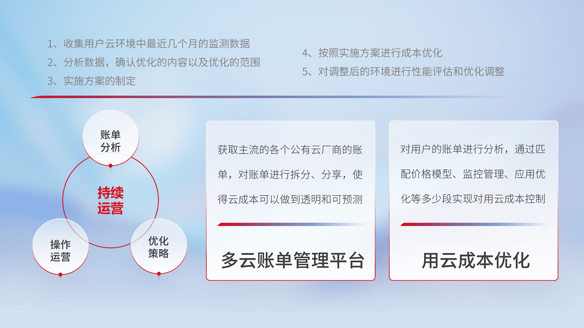 通过多云纳管,,,以统一的资源数据模型把客户的云资源进行抽象和封装,,进而实现对多云资源的统一操作,,,保障云资源管理的可靠性、、、、稳定性与可用性。。量身定制化运维内容,,,,配置、、、、开发运维、、、补丁管理、、、、备份、、监控、、认证和访问管理、、审计和日常巡检等,,,保障在用云过程中的可靠度,,稳定度以及高可用率。。。。