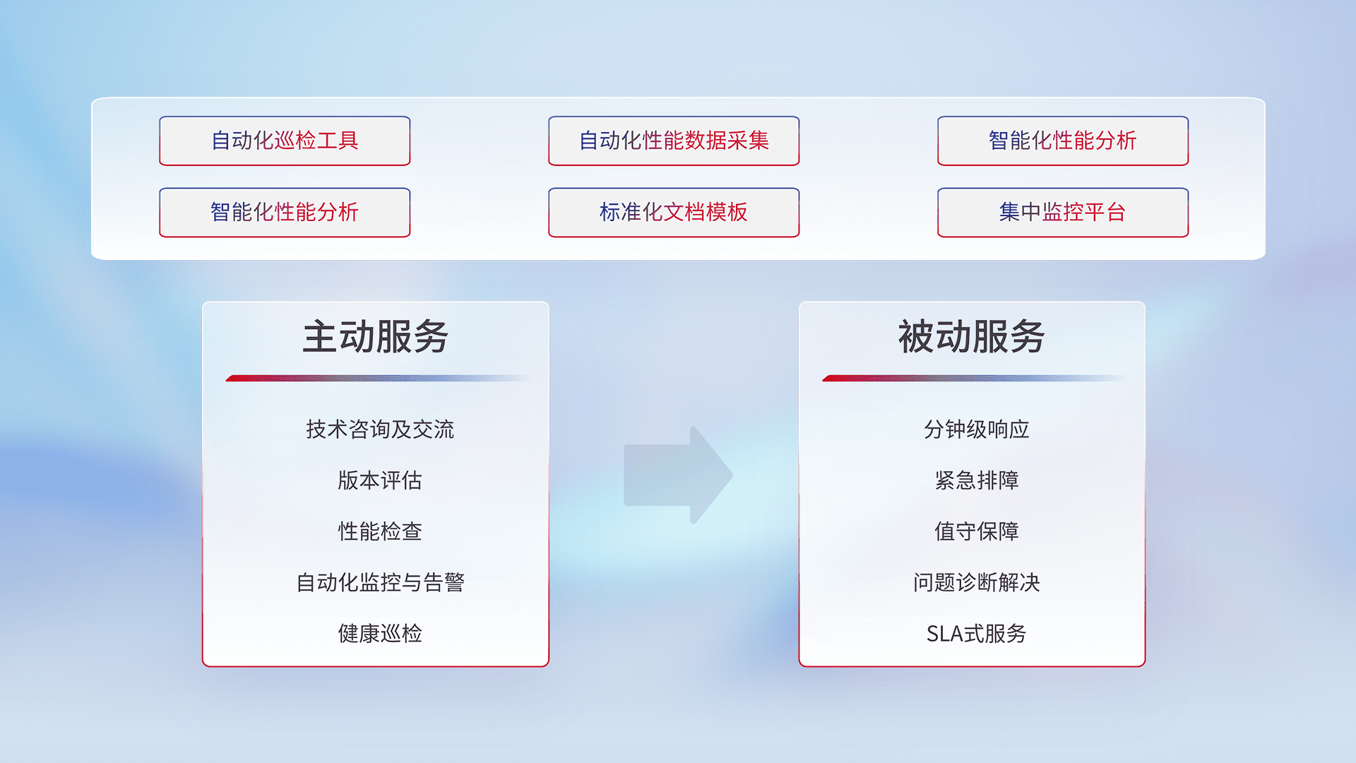 智能化工具和标准化文档,,,保障服务质量,,,提供主动服务(包含技术咨询、、版本评估、、性能检查、、、、自动化监控与告警、、、、健康巡检)和被动服务包含(分钟级响应、、、紧急排障、、值守保障、、、问题诊断解决、、、SLA服务)。。